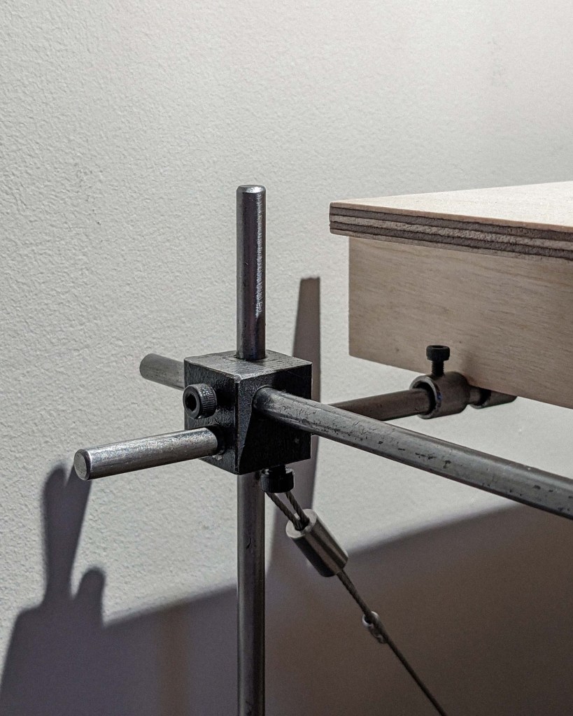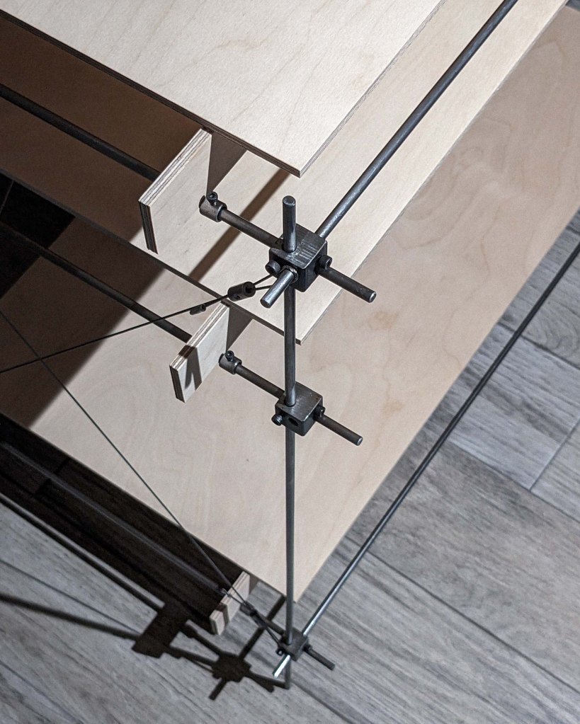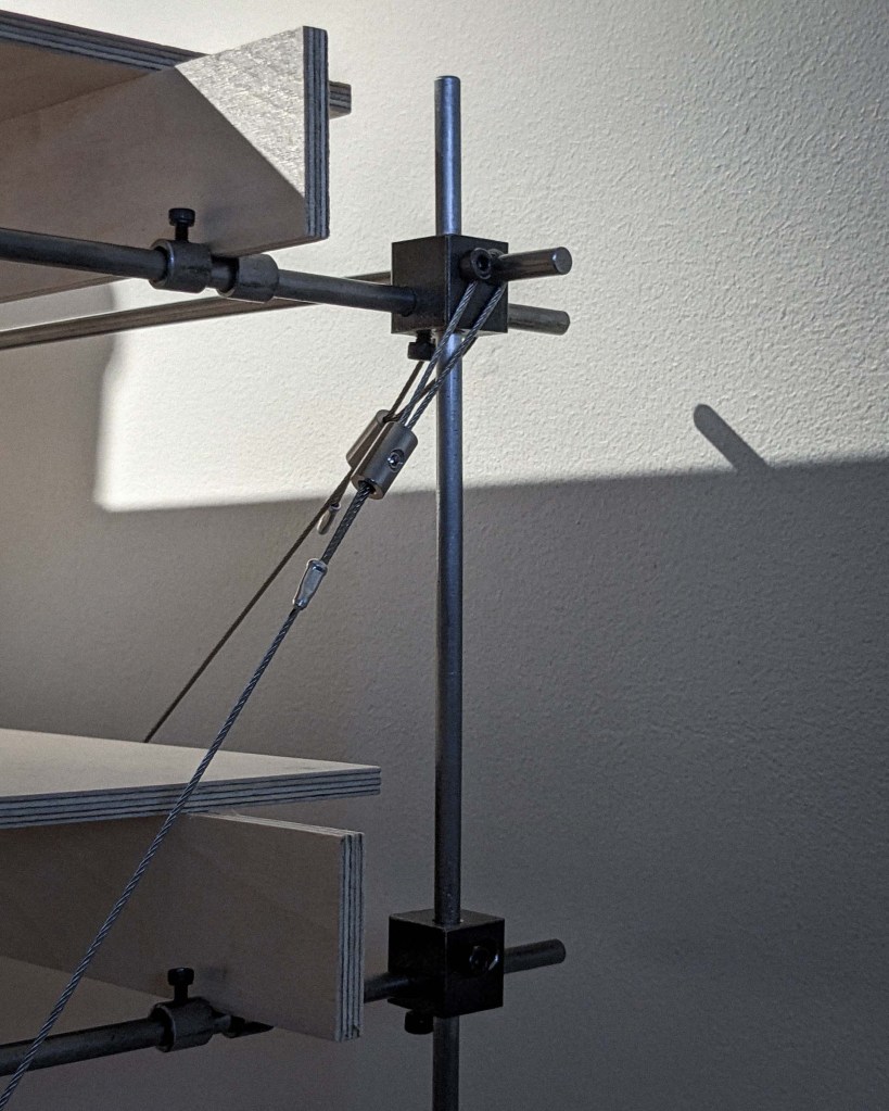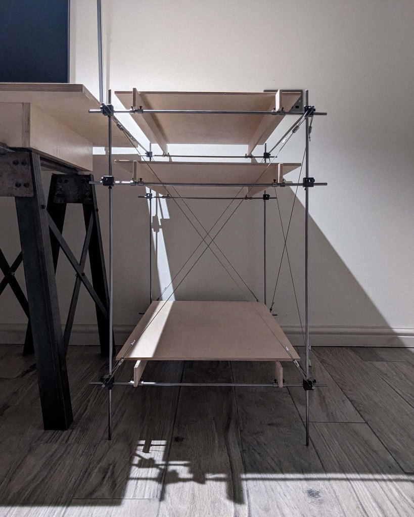 This project is born thanks to “A Wardian Case”. The reuse of the wardian case steel structure proves simple. Only one set of horizontal steel rods is replaced by 6 longer rods. The three decks are made by gluing small sheets of 9mm birch ply onto vertical strips of the same material. These vertical strips provide the necessary stiffness. A first load test highlights that the steel frame needs reinforcement to reduce deflection and avoid sway. Both issues are resolved by introducing tension-only braces. In retrospect, turnbuckles would allow for better control of the tension in each brace and the birch ply could have been even thinner.