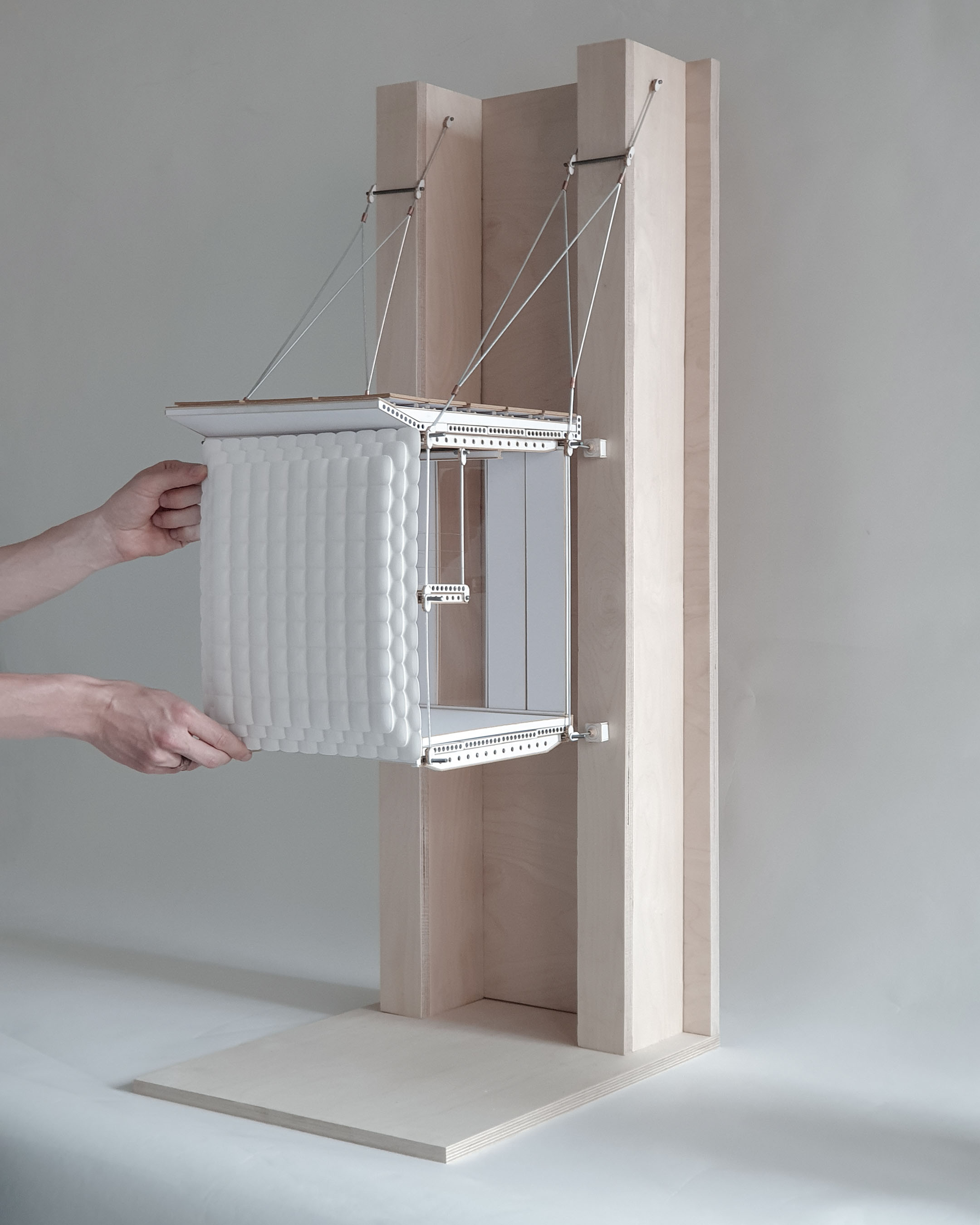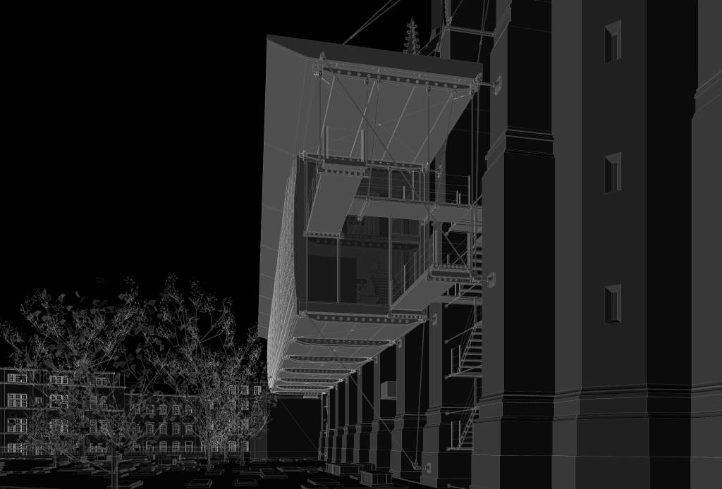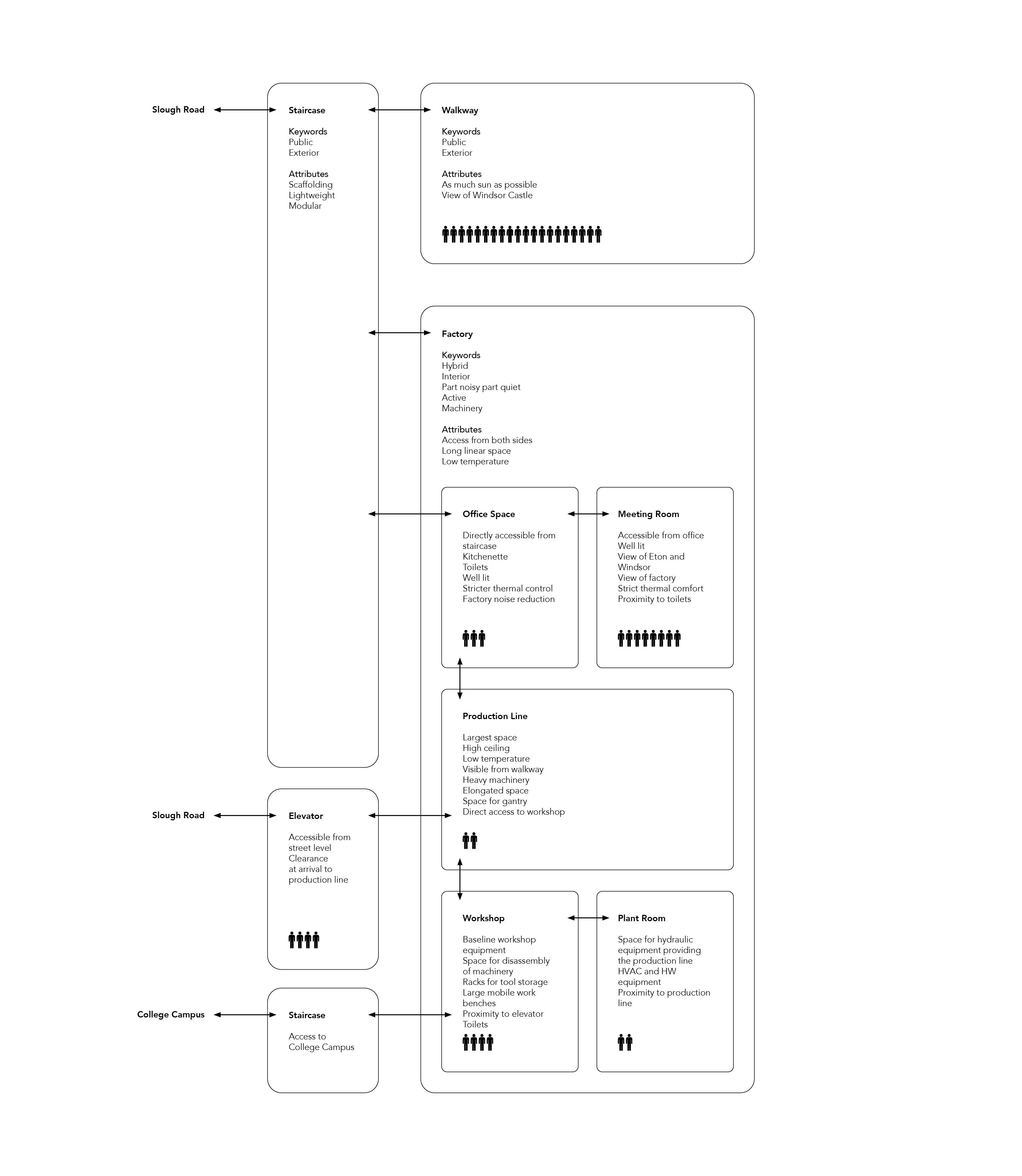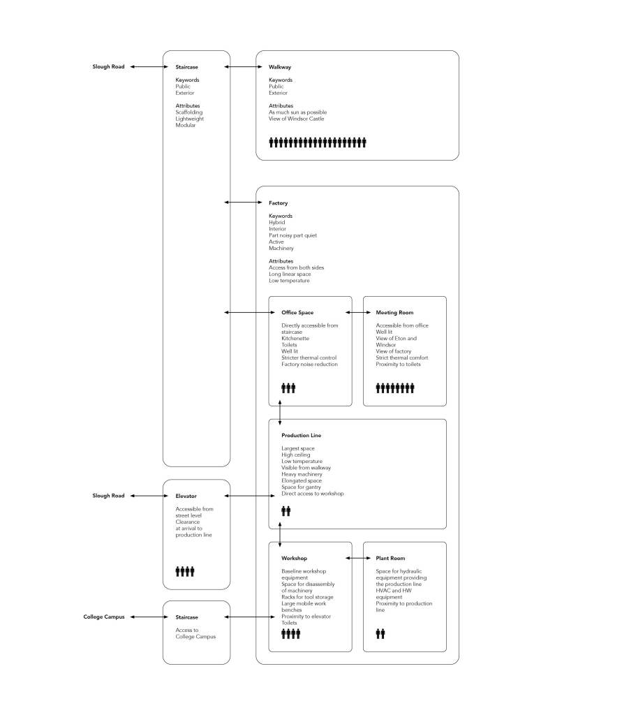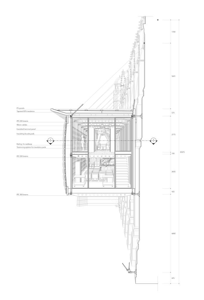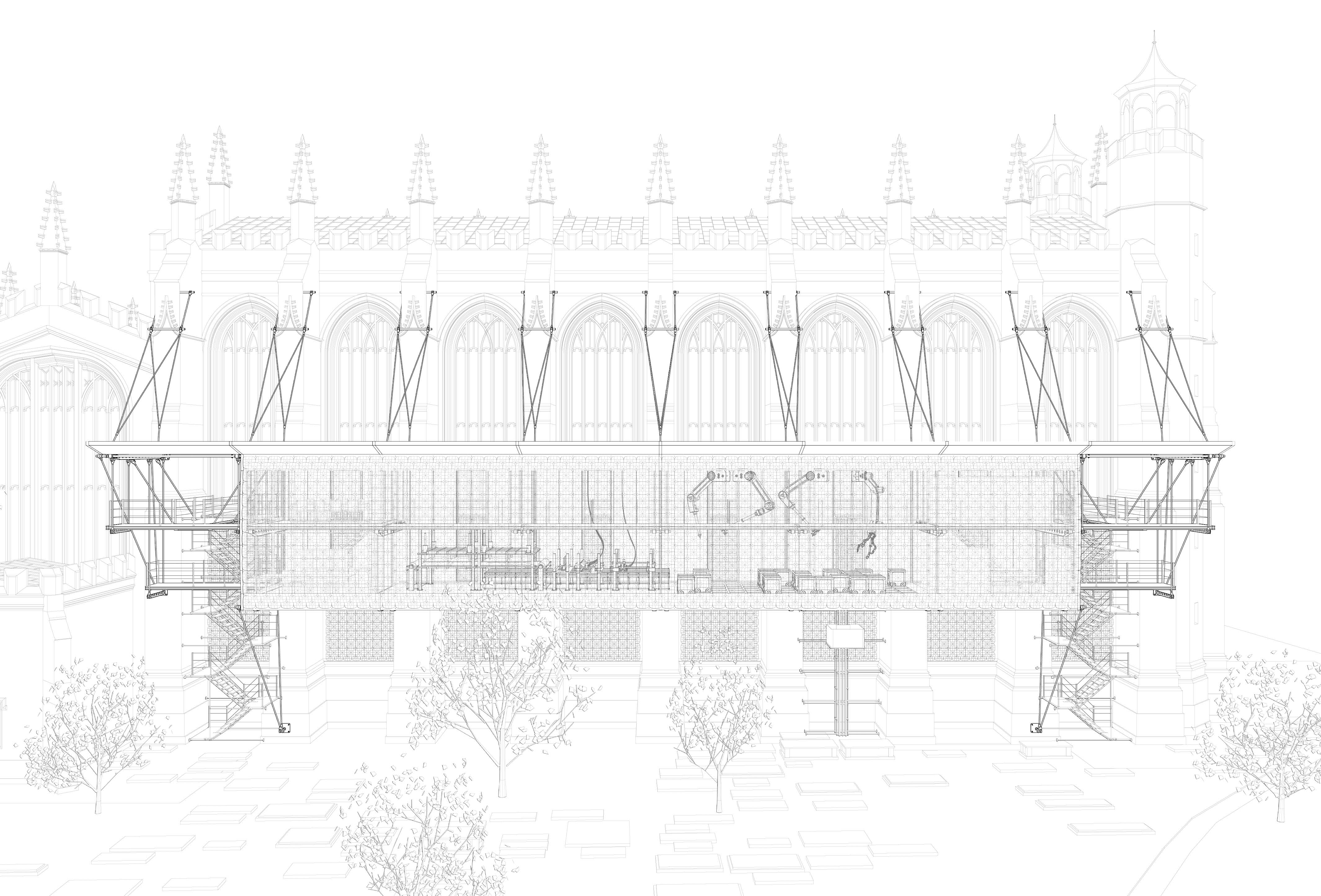 Each year the UK spends more than £1bn on patients affected by cold homes. Cold homes and fuel poverty are important issues. The aim of this project is to raise awareness through provocation. The proposal is a factory for the development of a scalable and affordable façade insulation product, applicable to existing buildings. This factory is entirely suspended from Grade II listed Eton Chapel, fully reversible and thus modular. Building components are made from steel and lightweight concrete. The entire production process is visible through a public walkway. The facility has 6 spaces, a long factory space, workshop for equipment maintenance, plant room, office, and meeting room.