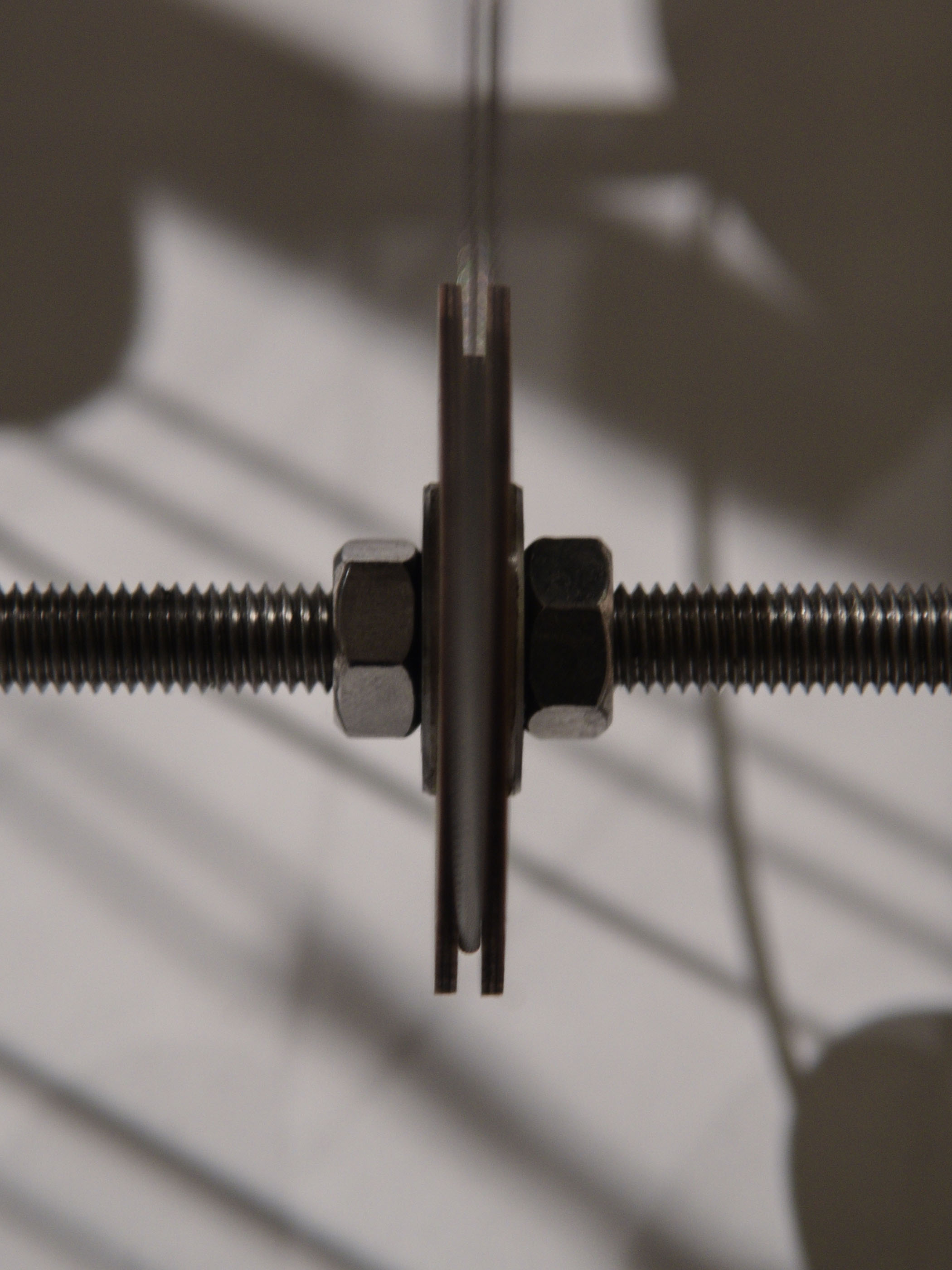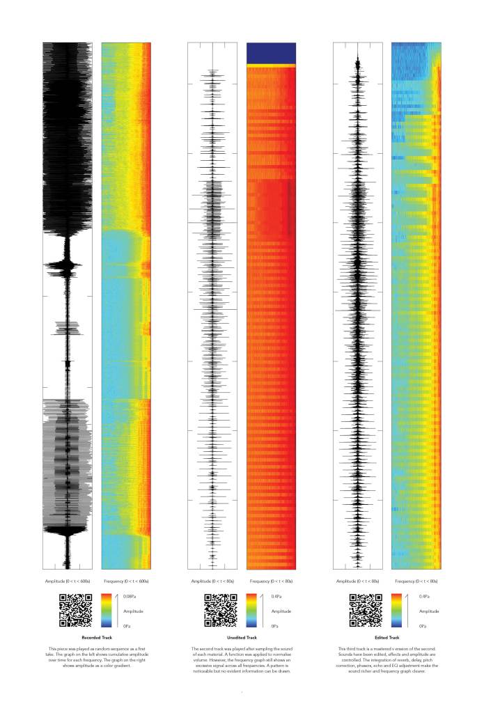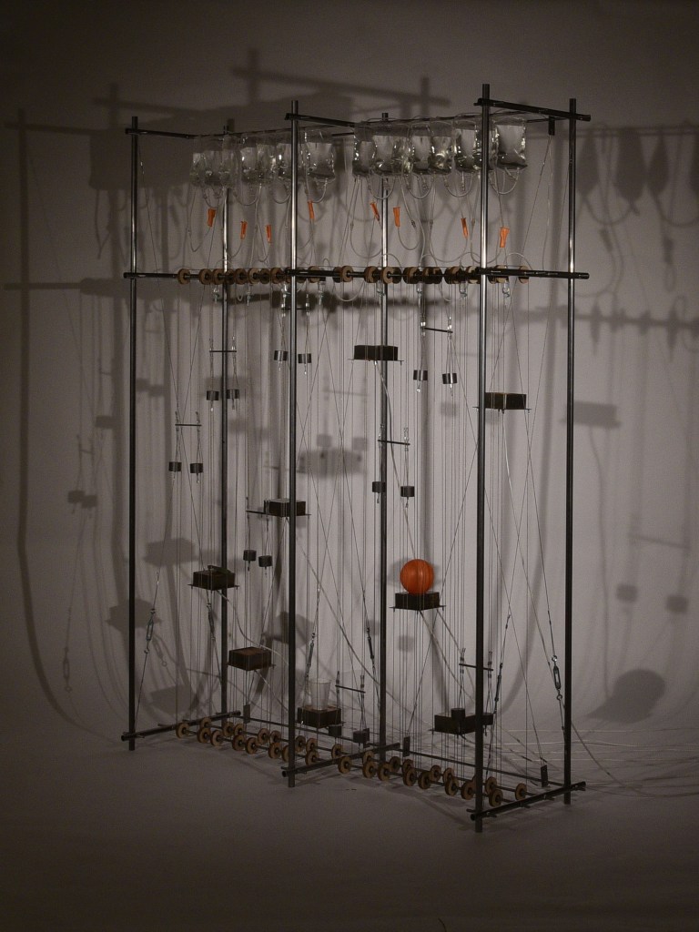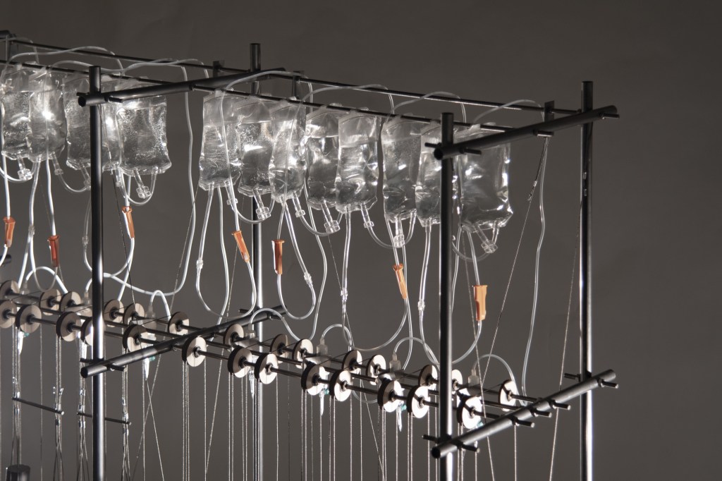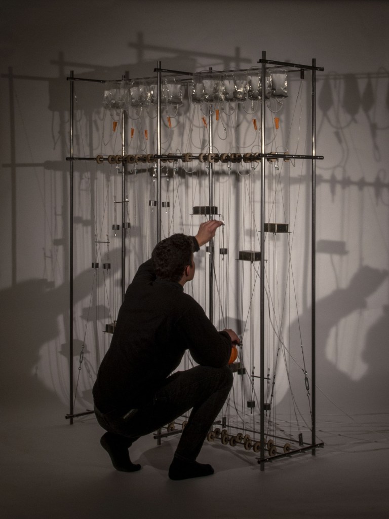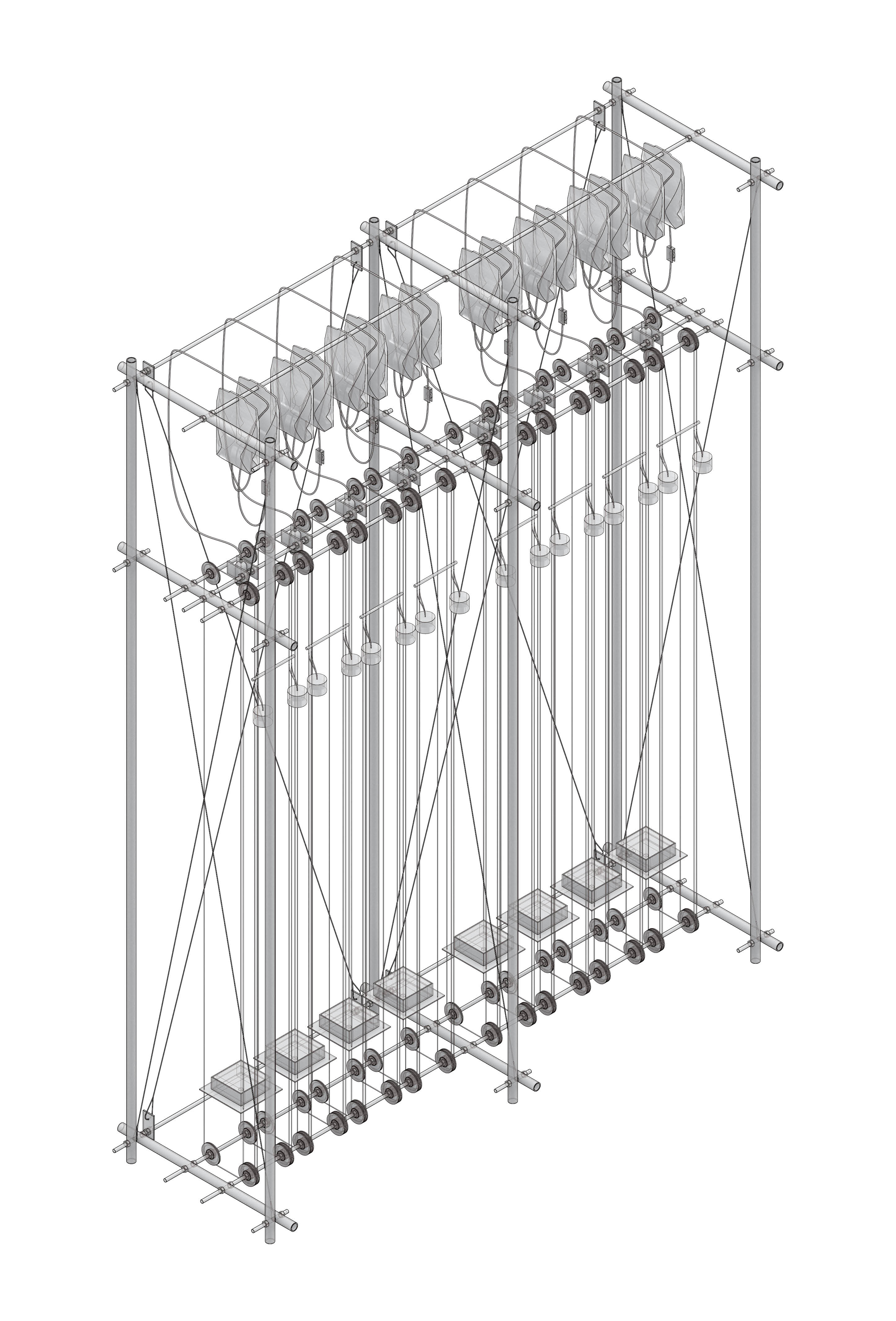 This interactive installation consists of a steel frame hosting 8 platforms, water drippers and medical blood bags, exploring the acoustic qualities of rain and how sound responds to material. Materials found at Bow Creek are subjected to the impact of artificial rain drops. The user interacts with the piece through two channels. Frequencies at which the water drops hit the 8 platforms are controlled through taps. Sound level is controlled by changing the platform height through a pulley system, effectively turning the installation into an automated, amplified drum. Adjusting the aforementioned two variables for all eight materials produces music. With the brief: “States of change / Changes of state” this apparatus intends to register and quantify the natural chaos of rain through sound data.