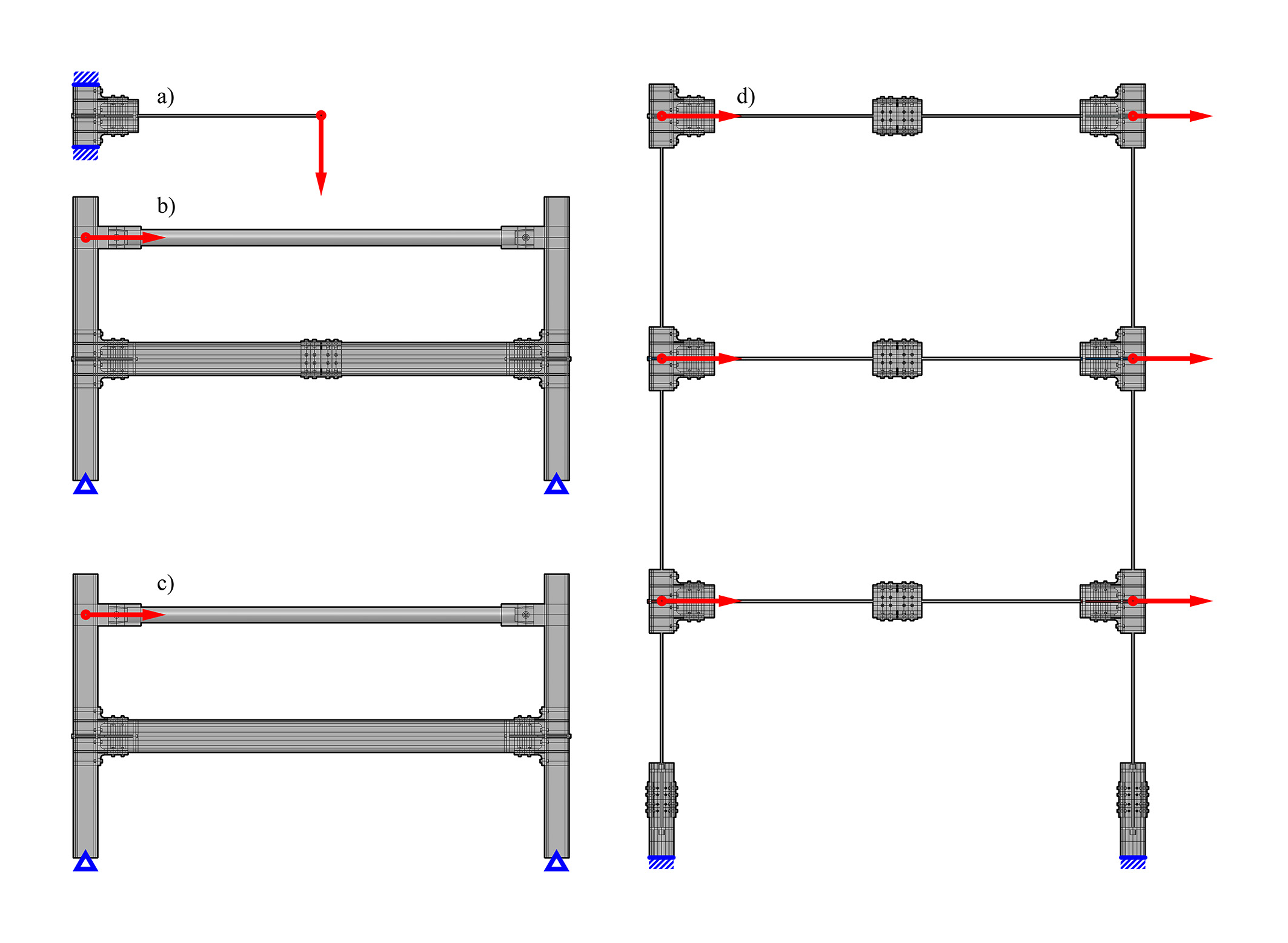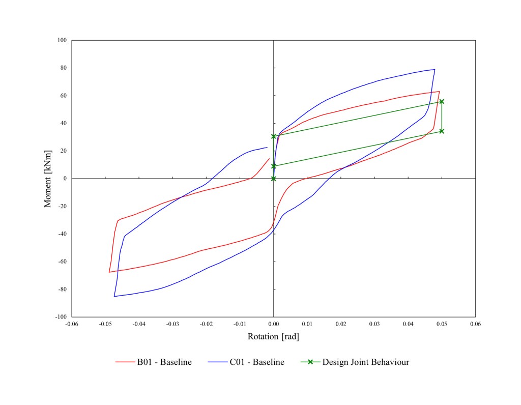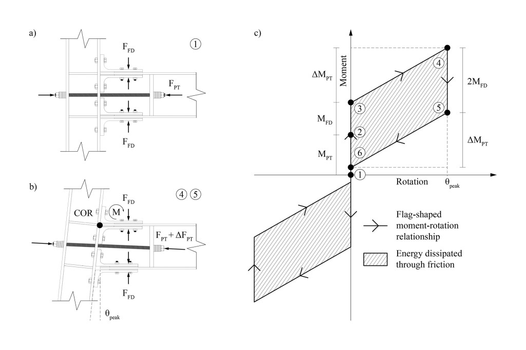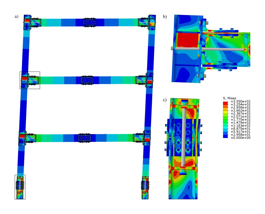 The study supports the development of SC BCJs for seismic zones through preliminary FEAs of physical test specimens. While FEA results of the BCJs’ local behaviour are promising, only the results for the quasi-static test specimens are conclusive. Results for the global response of the large-scale physical tests need further consideration. Local results indicate that the BCJ exhibits the expected flag-shaped M-R behaviour with good self-centring capabilities. At higher rotations, excessive plasticity in the L-plates and beam ends compromises self-centring. Frictional energy dissipation is primarily localised at the beam-end flanges, with smaller contributions from other surface interactions. Observed axial forces in friction device bolts exceed design values, increasing unintended frictional energy dissipation. Although material model variations have a limited impact on performance, using expected rather than nominal strengths improves self-centring. Slotted splice connections effectively mitigate the frame expansion effect at a frame level. Wire models prove computationally efficient with near-identical results.