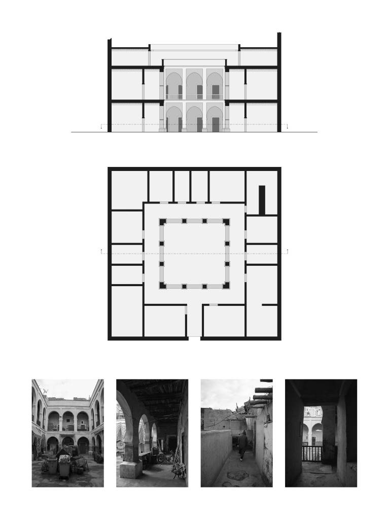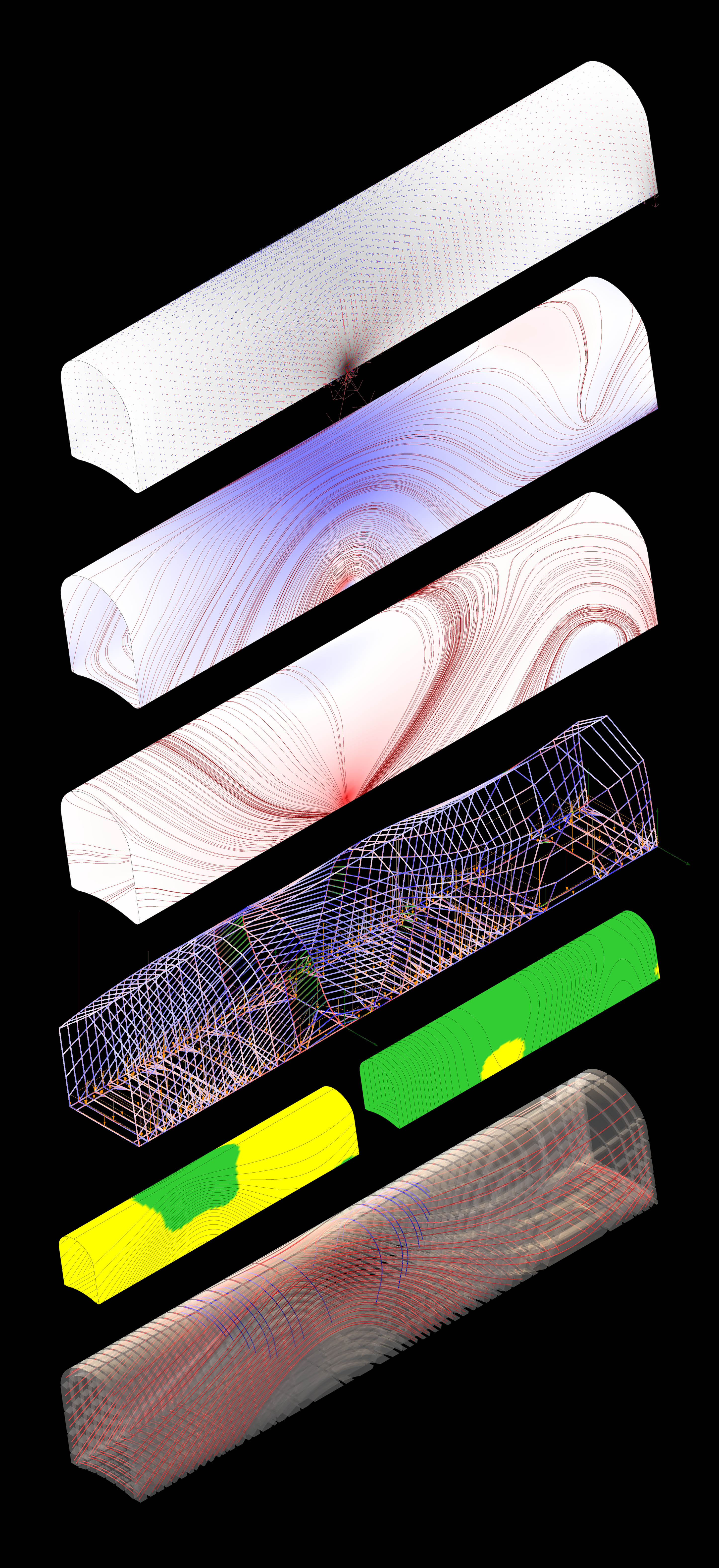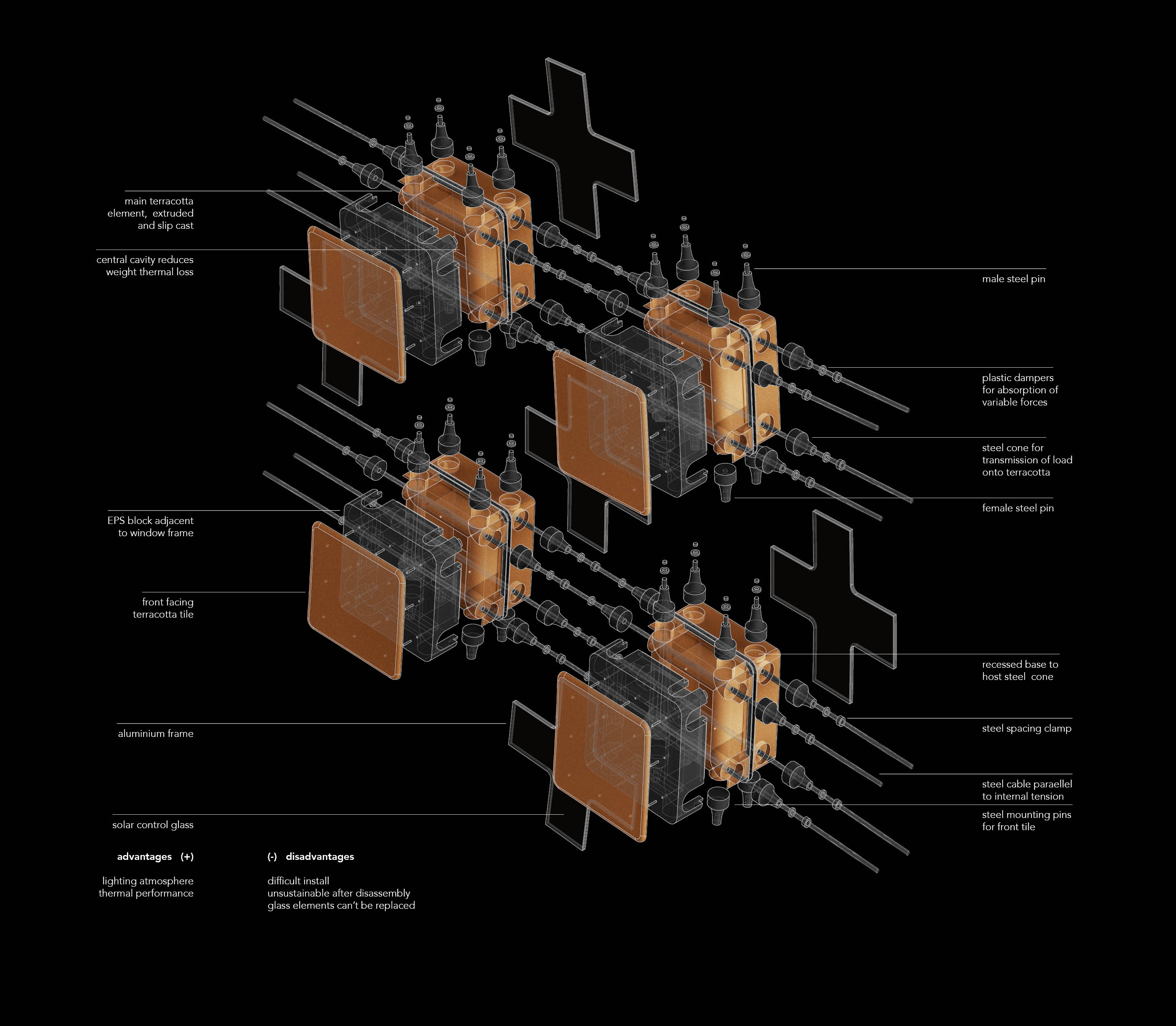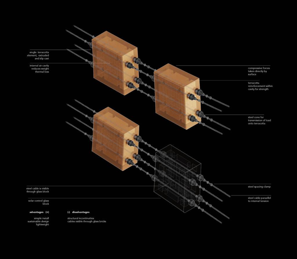 This project revisits the Moroccan Funduq by envisioning a contemporary research facility dedicated to innovating terracotta production. A mechanistic building is generated by the assemblage of extruded terracotta elements. The fractal geometry within the facade creates a dynamic, semi-permeable barrier responding to meteorological conditions. A set of vaulted terracotta structures sits atop the building, this is where the researchers working at the facility live. These vaults consist of precast terracotta elements, assembled and post-tensioned on site. An analysis of the stresses within these vaults, allows for a terracotta element arrangement and geometry, limiting the stresses between individual elements to tension and compression. The absence of shear and bending allows for thinner sections, less post-tensioning, and simpler fixings.
