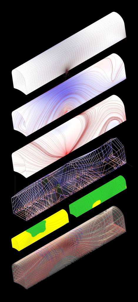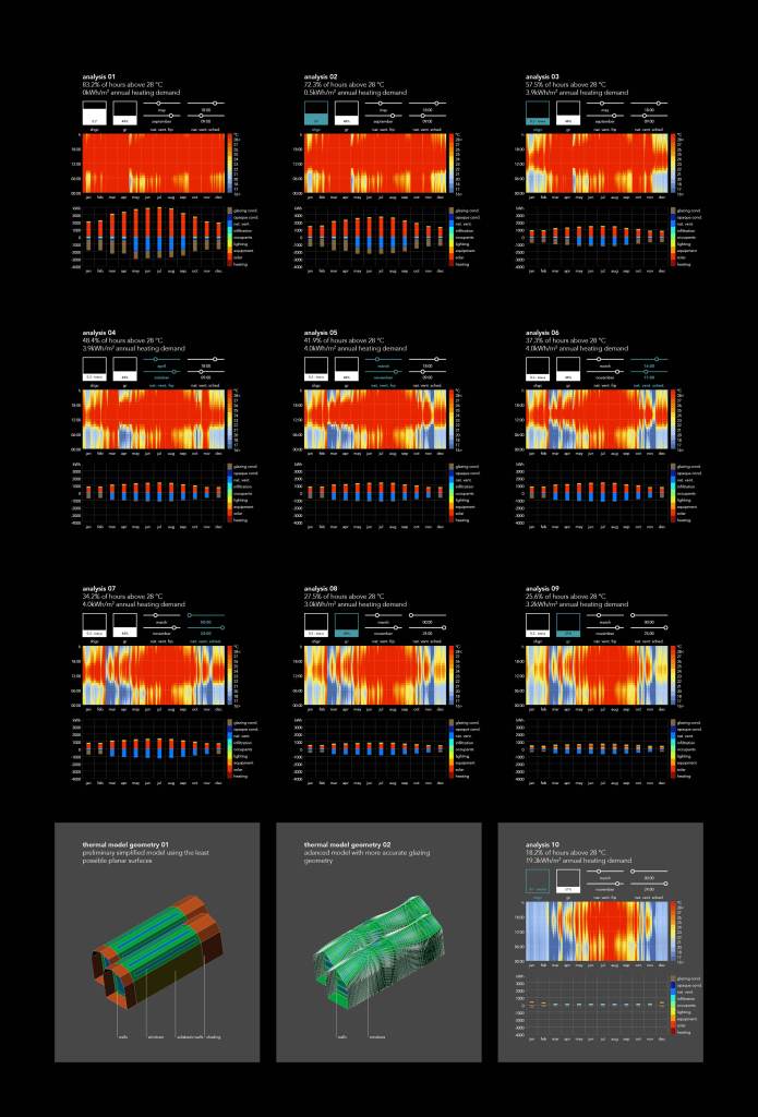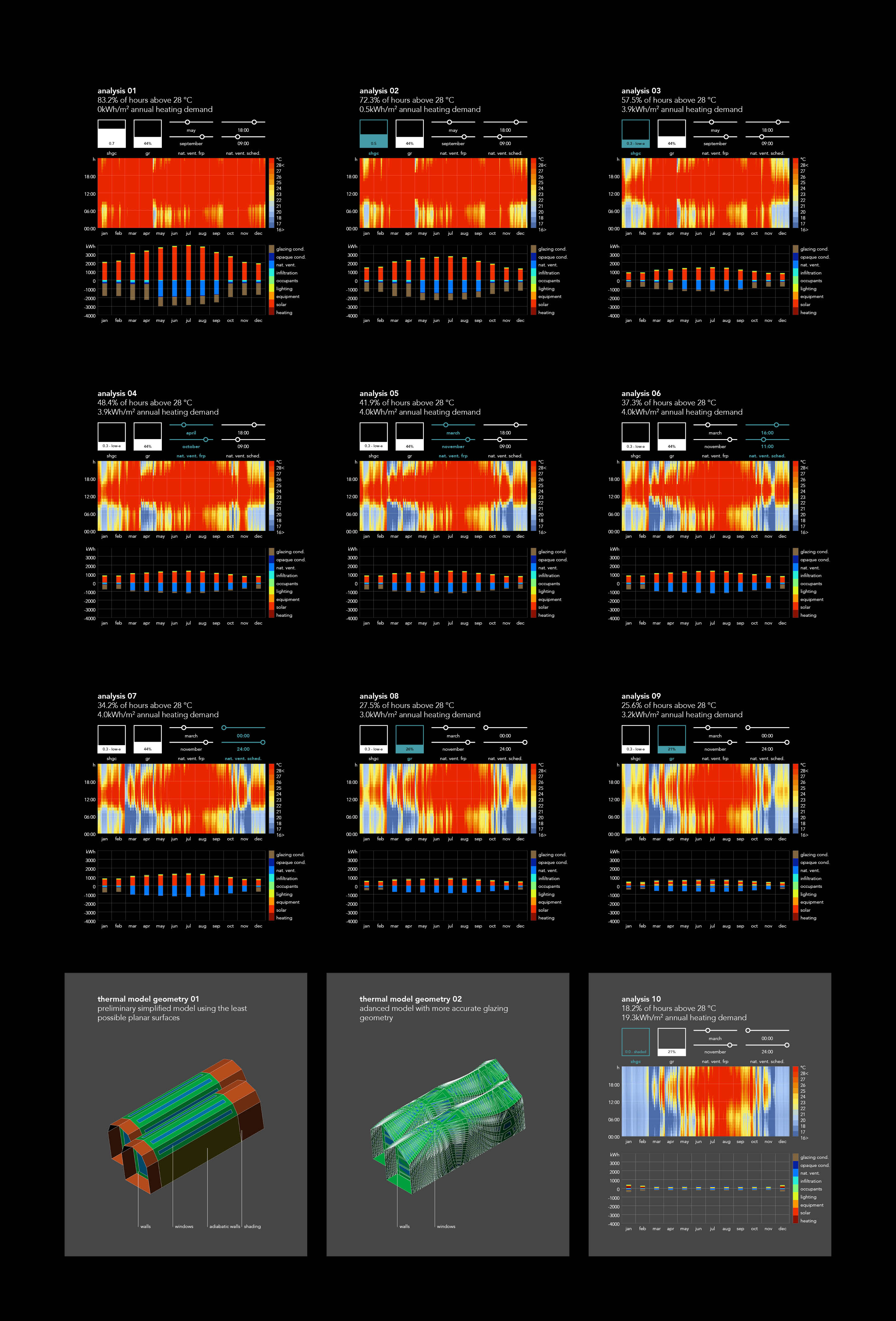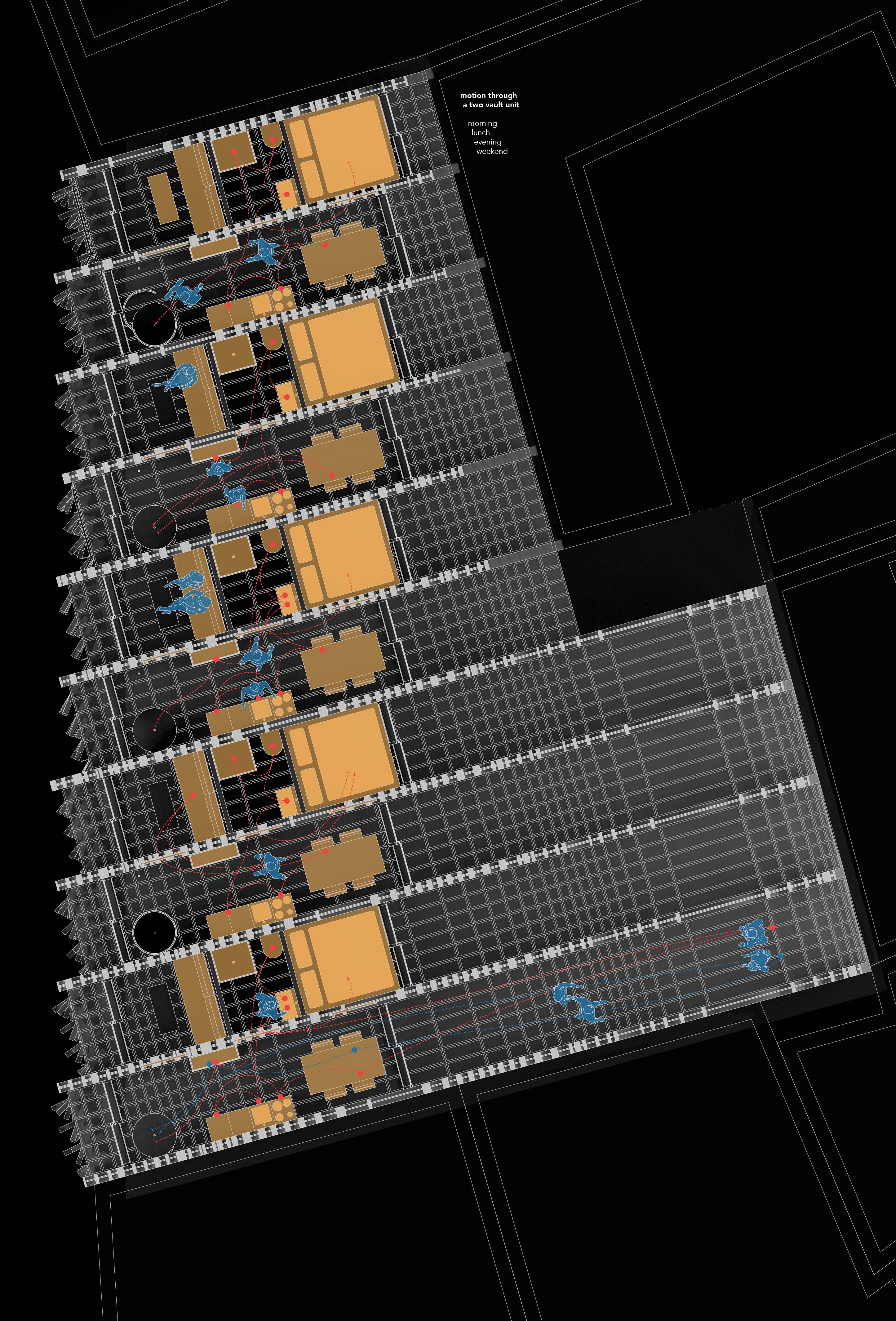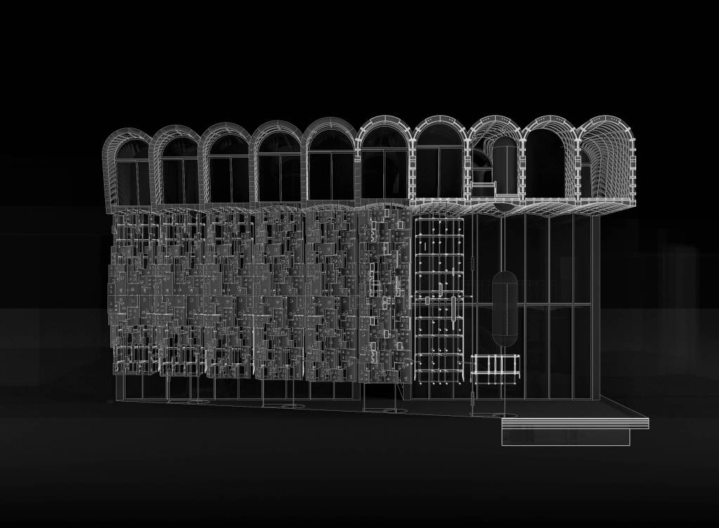 This project revisits the Moroccan Funduq by envisioning a contemporary research facility dedicated to innovating terracotta production. A mechanistic building is generated by the assemblage of extruded terracotta elements. The fractal geometry within the facade creates a dynamic, semi-permeable barrier responding to meteorological conditions. A set of vaulted terracotta structures sits atop the building, this is where the researchers working at the facility live. These vaults consist of precast terracotta elements, assembled and post-tensioned on site. An analysis of the stresses within these vaults, allows for a terracotta element arrangement and geometry, limiting the stresses between individual elements to tension and compression. The absence of shear and bending allows for thinner sections, less post-tensioning, and simpler fixings.